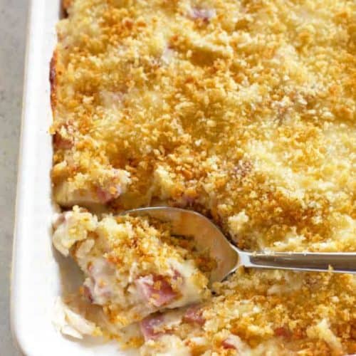- Butter pan. Spread chicken in the pan. Scatter chopped ham over chicken. Lay Swiss cheese on top of ham.