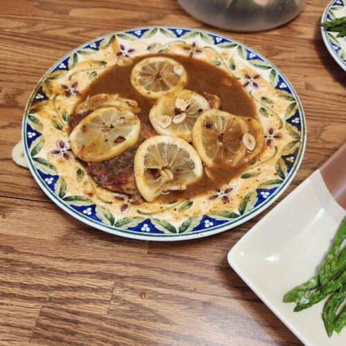 - Reduce the heat to medium and return the skillet to the heat. Add the remaining 2 tablespoons of butter and the reserved 1 tablespoon of the flour mixture to the skillet. Cook, stirring constantly, until the flour is toasted, about 1 minute. Add the garlic, lemon slices and the chicken broth to the skillet. Cook, stirring occasionally, until the sauce is bubbling and slightly thickened, and the garlic is lightly browned, 2 to 3 minutes. Spoon the sauce and sliced lemons over the chicken. Garnish with parsley and serve with lemon wedges, if you like.