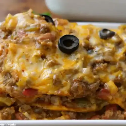 - Layer tortillas, meat mixture and cheese into 2- 3 layers of each.